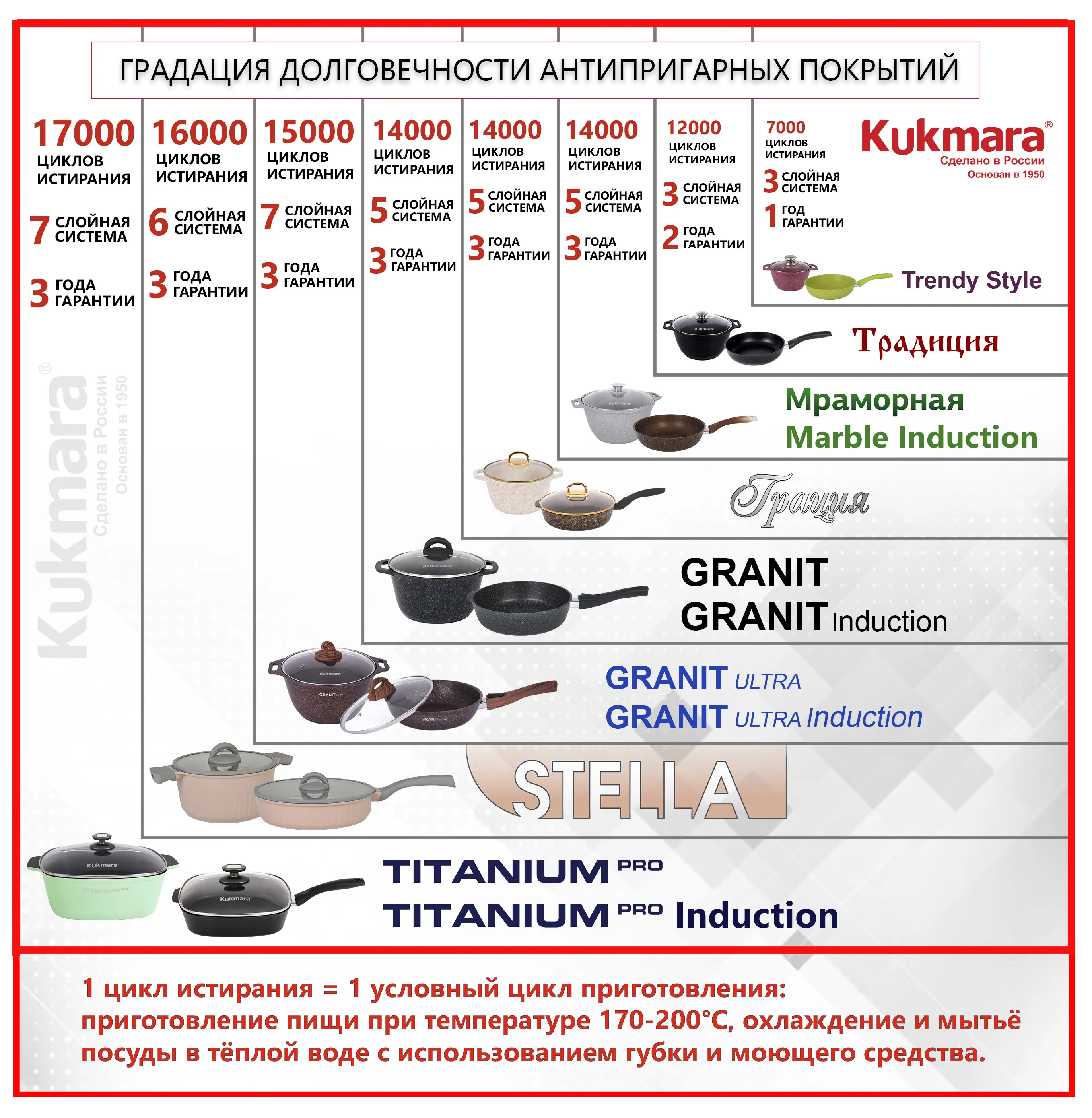Самая яркая линия продукции TM Kukmara - это линия “Trendy Style”. Увеличенная прочность внешнего и внутреннего покрытий надолго сохранят первозданную яркость и привлекательность посуды, а их превосходные антипригарные свойства будут радовать на протяжении очень долгого времени. Антипригарное покрытие этой линии выдерживает не менее 7 000 циклов истирания. С предметами из коллекции “Trendy Style” готовка никогда не покажется скучной повинностью, а станет увлекательным кулинарным приключением с неизменно отличным результатом, который понравится и вам, и вашим близким!